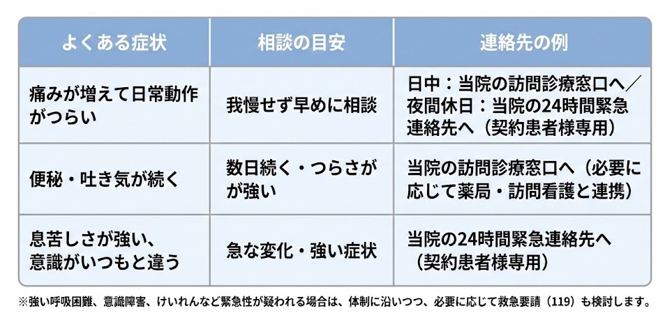 転倒、発熱が続く、痛みが急に強くなった、息苦しさが増した等の際は、まずお電話ください。状況に応じて、当番の医師・看護師が電話での指示を行い、必要に応じて緊急往診、または連携病院への救急搬送の調整を行うことがあります。