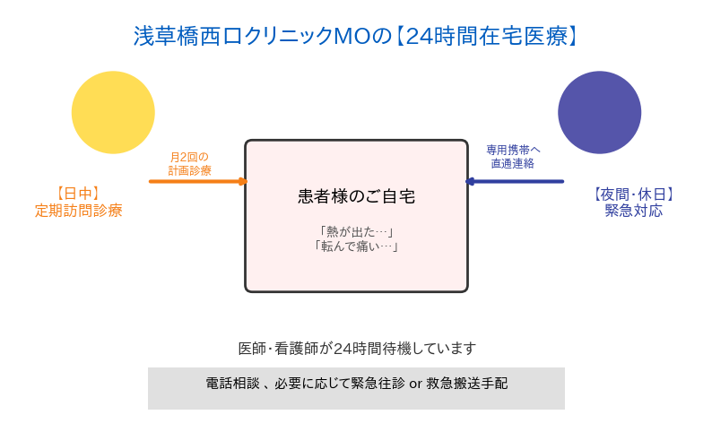 浅草橋西口クリニックMoは、「24時間繋がる安心」と「専門性の高い医療」で、患者様とご家族の穏やかな生活をサポートします。 台東区・浅草橋周辺で訪問診療をお探しの方は、ぜひ一度ご相談ください。